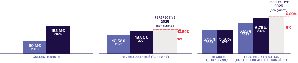 Le taux de distribution 2024 s’est établi à 6,75% brut de fiscalité étrangère, une performance supérieure à l’objectif cible (5,50%) et à l’objectif annuel annoncé qui se situait entre 6,00% et 6,50%. Cette surperformance illustre la qualité de nos investissements et le dynamisme propre aux jeunes SCPI. Tout en rappelant que les performances passées ne préjugent pas des performances futures.