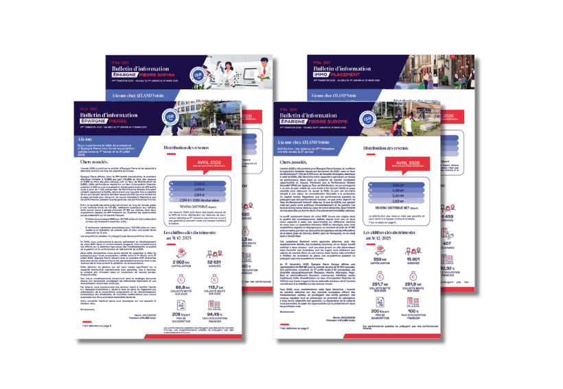 Avertissements : L’investissement en parts de SCPI comporte des risques, notamment un risque de perte en capital, le capital n’étant pas garanti, et un risque de liquidité, la revente des parts n’étant pas garantie. Les revenus et rendements ne sont pas garantis et peuvent varier à la hausse comme à la baisse. Les performances passées ne préjugent pas des performances futures. Les acquisitions réalisées par les SCPI gérées par ATLAND Voisin ne préjugent pas des acquisitions futures, ni de la performance annuelle ou future des SCPI. Ceci ne constitue pas un conseil en investissement financier. Communication publicitaire.