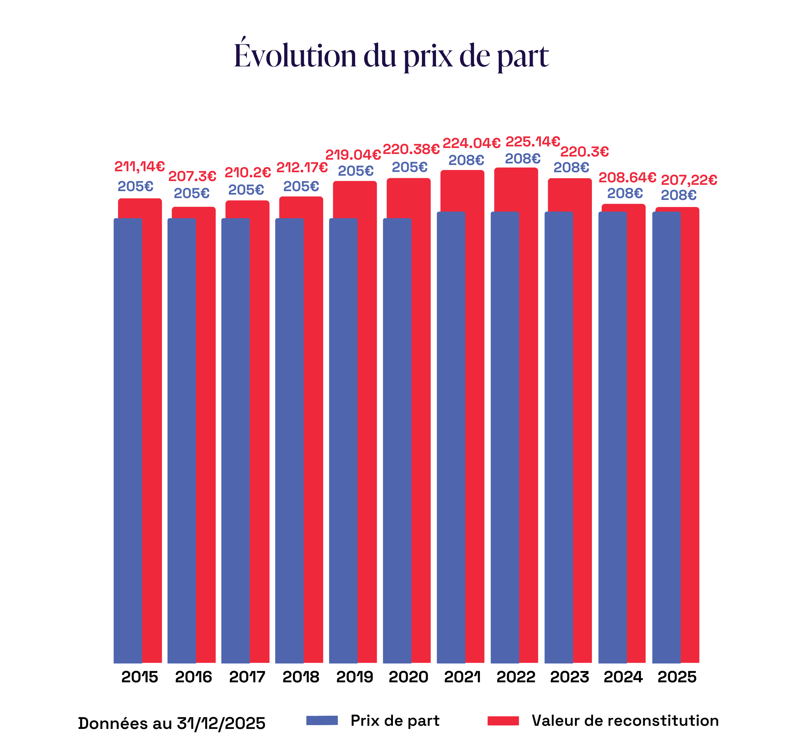 Depuis sa création en 2013, Épargne Pierre affiche une performance nettement supérieure à la moyenne du marché. Pour rappel, les performances passées ne préjugent pas des performances futures. Elle a convaincu près de 53 000 investisseurs particuliers (chiffres arrondis, au 31/12/2025), grâce à sa stratégie qui repose sur trois piliers :